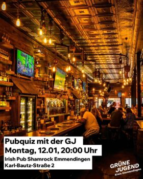 Erneut laden wir euch ein, am 12.01. um 20 Uhr gemeinsam zum Pubquiz im Irish Pub Shamrock in Emmendingen zu gehen. Hier wollen wir im entspannten Rahmen über Politik diskutieren und natürlich versuchen das Quiz als Team zu gewinnen.Kommt also gerne vorbei und bringt euer Spezialwissen mit.